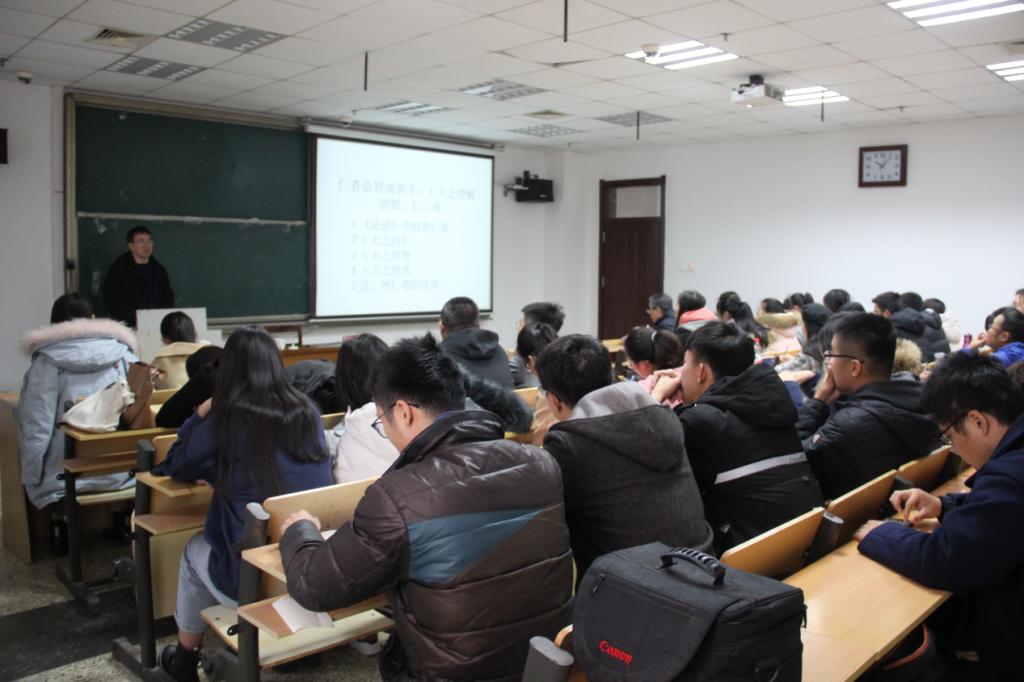 首先,姚春鹏教授向在场师生介绍了谭明冉教授的个人履历和学术成就。随后,谭明冉教授分别从《论语》中的智仁勇、王夫之的仁、王夫之的智、王夫之的勇、量:智仁勇的统率五个方面对“王夫之理解的智仁勇”进行讲解。谭教授认为智、仁、勇作为三达德,各有其根源和功能,虽相互联系,但本质上是相互独立的。王夫之将智、仁、勇分别归类于心、性、气之功能,坚持智、仁、勇三者并峙,从而使心性修养的理论上升到一个新的高度。关于王夫之的仁,谭教授讲解:王夫之从理和情两个方面来讨论仁,一方面接受朱熹“仁者爱之理”的观点,另一方面,王夫之还认为仁是“理之爱”。关于王夫之的智,谭教授讲解:王夫之认为,人生的最高理想境界就是“成仁”或“安仁”,一个自然的结论就是,知道“仁”与否也是评价智或愚的标准。同时王夫之也警告“智(心之灵明)”必须以仁为准,为仁的实现服务,才能避免“流荡不法”和明察伤物。关于王夫之的勇,谭教授讲解:首先,勇的养成是一个持续不断的过程,其次,即使君子之勇(大勇),其养成方式与匹夫之勇也并无本质区别。最后,在“量是智仁勇的统率”方面,谭教授讲到,最大的“量”就是要考虑到和能接受一切可能的事,它既超越生死成败,又是对自己的所作所为的清晰认识和从容决断。以“量”作为标准,王夫之指出了智、仁、勇独自行事的不足:第一,“成大业者”在量而不在智;第二,仅靠勇也不足以成大事。