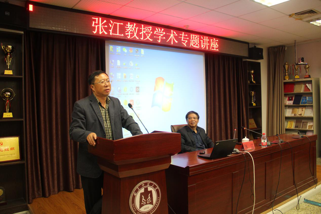 首先,王维先院长向在场的师生介绍张江教授的个人履历和学术成就,张江教授长期从事文艺理论和文学批评研究工作,近年来主要致力于当代阐释学的构建和阐释学学科建设,2014年提出原创性理论“强制阐释学”,在中外学术界产生重要学术影响,2017年进一步提出原创性理论“公共阐释学”,得到德国、英国、意大利等国家历史学、哲学、文艺理论界专家学者的广泛关注。