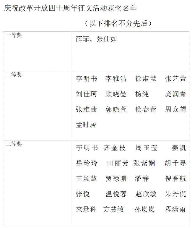 在学校党委宣传部组织的庆祝改革开放40周年主题征文比赛中,色情论坛 积极组织,学生踊跃参加,共220篇征文提交学校。经过学校评审,薛菲、张仕如2人荣获一等奖,李明书、李雅洁等13名同学荣获二等奖,齐金枝、周玉莹等20名同学获得三等奖,他们在本次征文活动中真情流入、有感而发,其他参赛同学同样笔下生花。所有参赛者都将自己心中的曲园复兴与对改革开放的展望描绘尽致。
