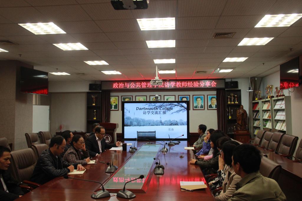 本次交流会由张淼老师分享他在美国藤校联盟之一达特茅斯学院为期两年的访学经历,根据他的所见所闻结合图片进行了详实的报告。张淼老师首先介绍了达特茅斯学院的基本概况和地质环境以及资源分布情况,指出其在课程设置、学生活动、教学大纲等方面与我国高等教育的不同之处;随后他分享了在人文学院同合作导师进行专业会谈,参与国际学术会议,拜访海外汉学家的经历;最后张淼老师从学生、教师、学术与生活三个方面发表了自己的心得体会,并同与会教师进行热切的交流。