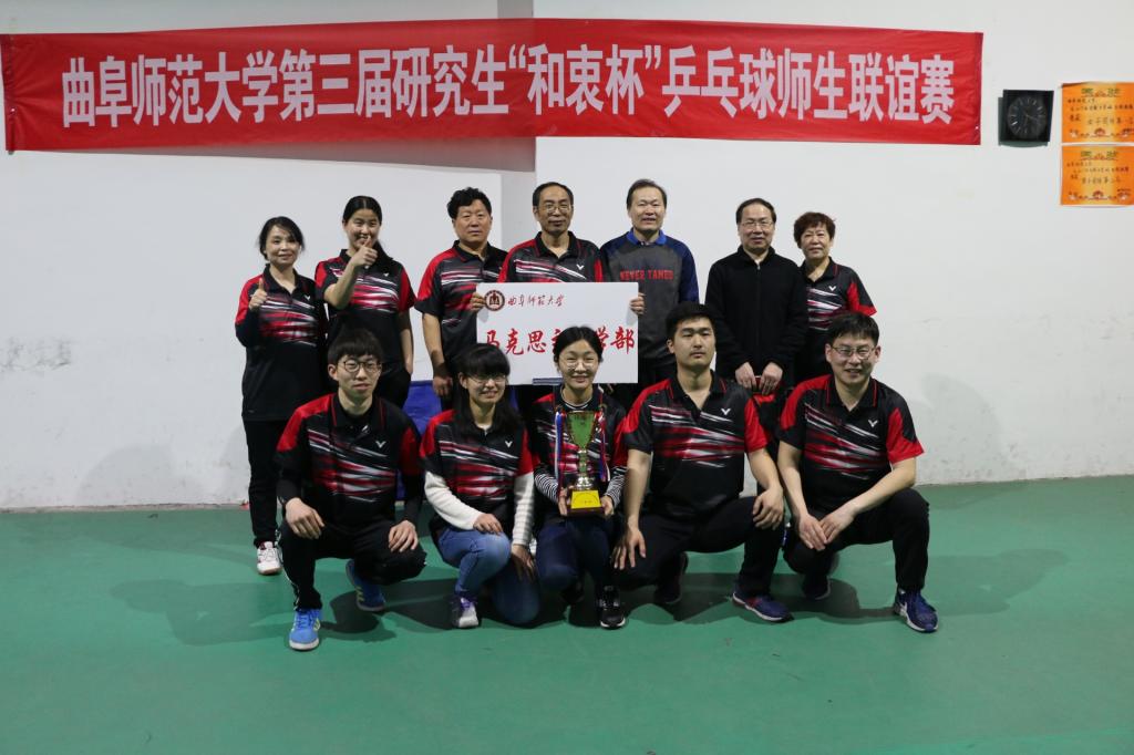 4月9日到13日,由研究生处主办的第三届研究生“和衷杯”乒乓球师生联谊赛在日照校区乒乓球馆举行。我部组建了强大的代表队。领队:王维先,队长:铁省林,教师队员:郑曙村、张立兴、李安增、刘煜、吴雪玲、陈敏,研究生队员:王瑞、王丽丽、赵开开、李泽明、任晓艺。经过五天、两个阶段的激烈角逐,我部成功卫冕。