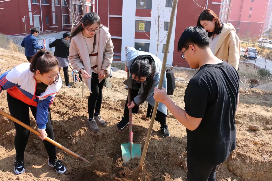 在校东操场空地植树现场,学部师生分工协作,挖坑扶苗、挥锨固土有秩序的栽种起一株株白杨树苗,在春光和煦下以饱满的热情为曲园增添新绿。