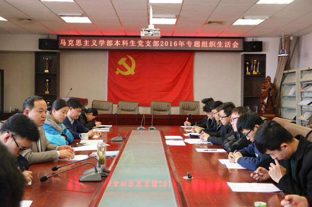 3月8日,马克思主义学部本科生党支部2016年专题组织生活会于JC909举行。学部党委副书记刘进,团委书记陈敏,辅导员张华、韩凯辉出席,全体本科生党员与会。