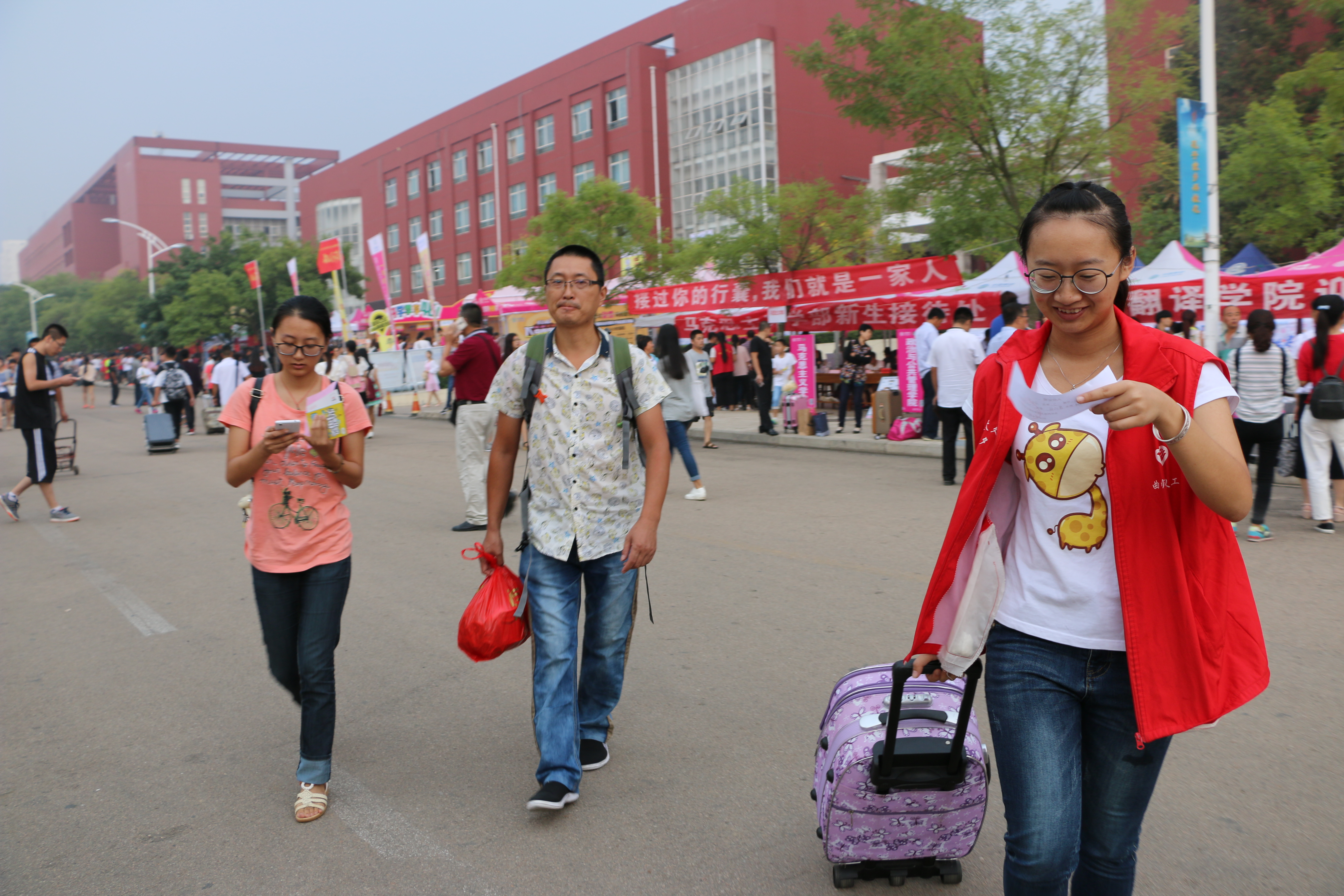 一个满怀关心和不舍的眼神、一副为孩子背着沉甸甸书包的坚实臂膀、一句反复的叮咛,渗透着一对对父母对孩子最深沉的爱。“可能是第一次离家的原因,爸爸自下车就一直替我背着书包,以前上学的时候,他可从来不会替我背包,他总说‘自己的事情自己做’”,一位办完报道手续的新生说道。期间,学校领导荆兆勋、康淑敏和学校办公室、学生工作处等部门负责人以及张立兴、李安增、王维先、刘进、陈敏、张华、韩凯辉等学部领导老师亲临现场指导工作,看望新生和家长并感谢迎新工作人员的辛勤付出,2016级辅导员陈敏更是全天候陪同迎新。