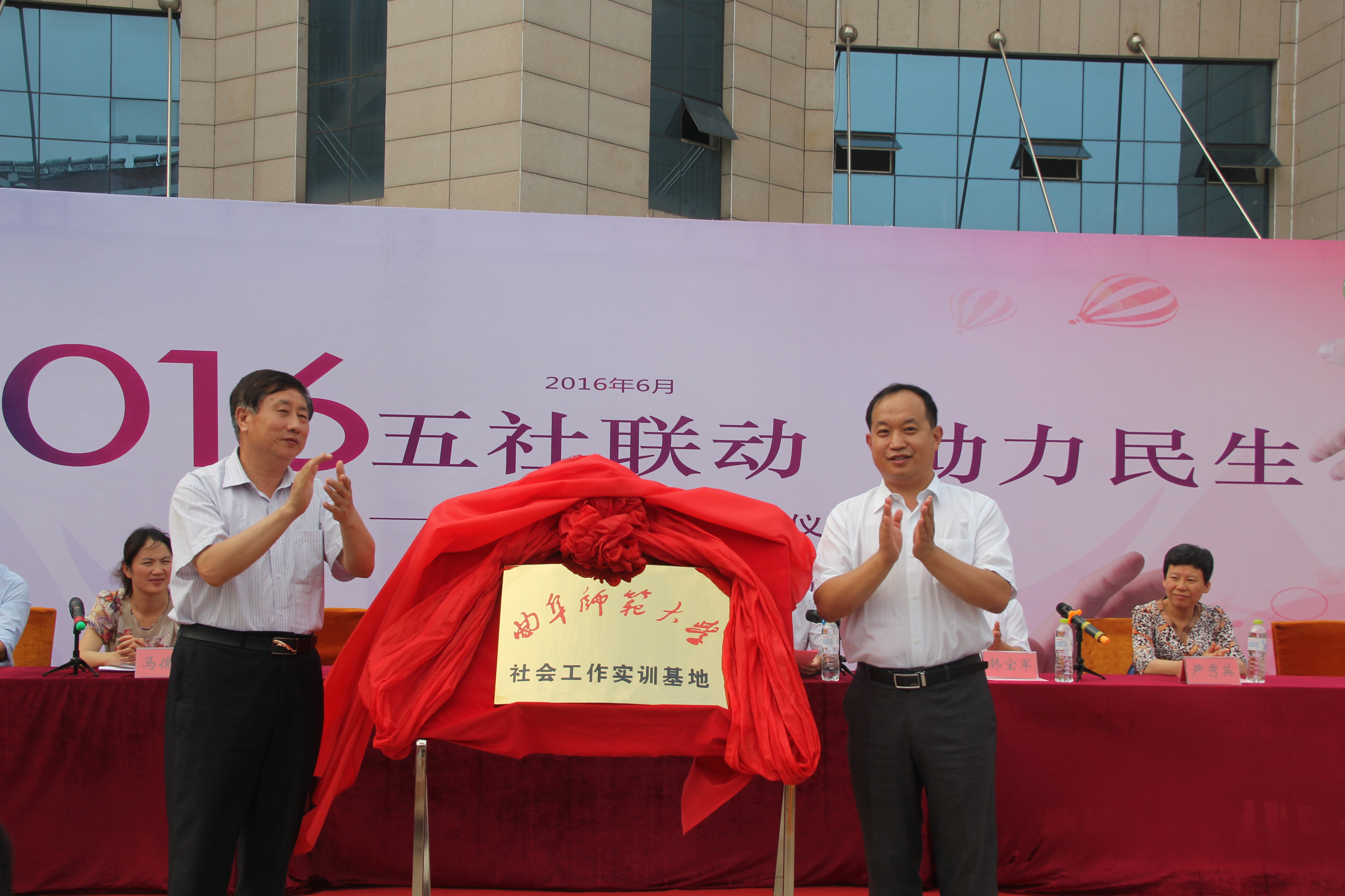 社会工作实训基地揭牌仪式。日照市民政局党组副书记彭为鹤、五莲县副县长赵百顺、五莲县民政局局长韩宝军、马克思主义学部党委副书记刘进等领导出席并参加了揭牌仪式。