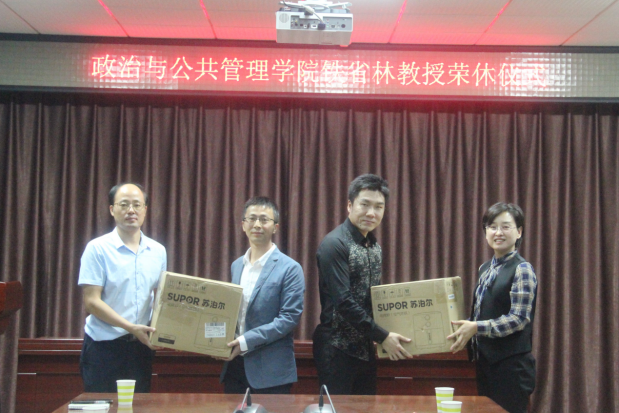 学院党委书记卢瑞霞为铁省林教授颁发荣休纪念品