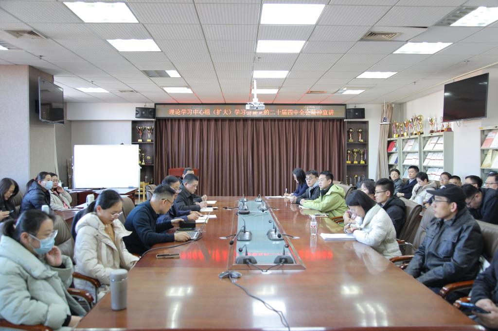 于C909召开党委理论学习中心组(扩大)学习会暨党的二十届四中全会精神宣讲活动。学习会由学院党委副书记、院长李增元主持,理论学习中心组成员、全体教职工(扩大)参加。