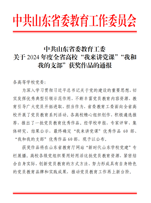 日前,中共山东省委教育工委正式公布了关于2024年度全省高校“我来讲党课”“我和我的支部”的获奖作品,色情论坛